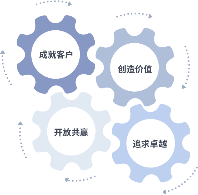 成就客户是一切决策的出发点,,创造价值是衡量所有工作的标准,,,,追求卓越是我们做事做人的态度,,开放共赢是我们的格局也是最终的结果。。价值观的齿轮环环相扣,,,推动着组织里的每个人不断向前。。。。